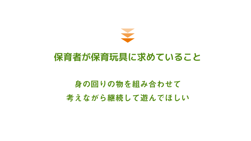 保育玩具に対して、日々のメンテナンスについての不満や発言が見られたが、長期継続的使用の観点から見ると玩具の発展性が少ないことへの影響が大きいことがわかった。その中で、保育玩具は園児自身が身の回りのものと組み合わせたりしながら考えて遊びを発展させてほしいという本質的な欲求があることがわかった。