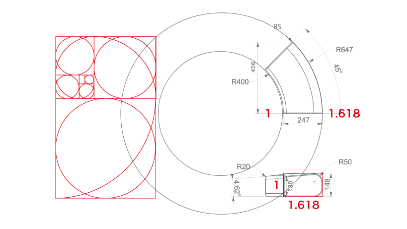 より低い乳児用のイスの高さを基準とし、各寸法に黄金比を採用しデザインした。