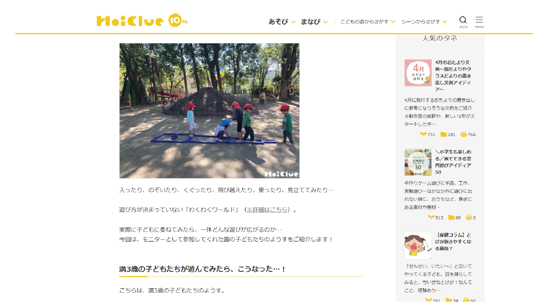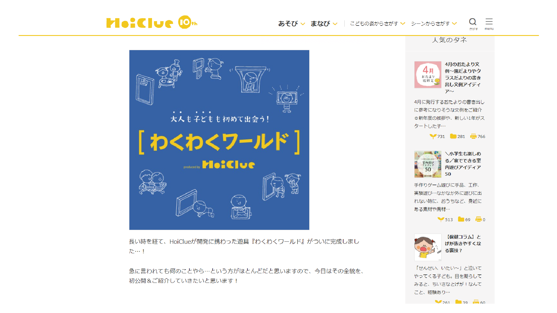 共同開発企業運営サイト「ほいくる」で紹介して頂いた。開発経緯や遊び方など、保育者へ向けた内容を掲載。
