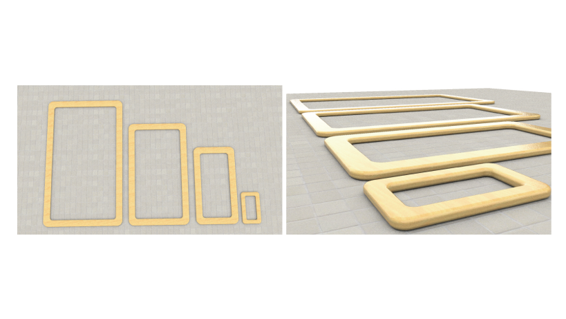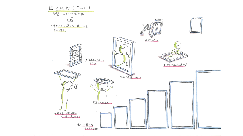 インタビューの中から得られた「抽象的な形状のほうが子どもは飽きにくい」ということと、大きさの違いが遊びの違いに繋がるというアイデアを組み合わせた「枠」を基本としたデザインを発案。