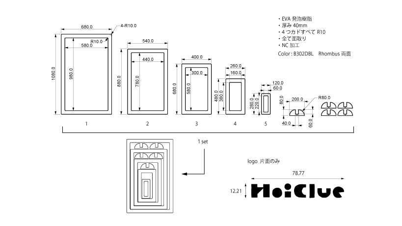 年長だけでなく、年少児も遊ぶことを想定し安全性の高いEVA発泡樹脂で進めることとし、再度寸法やセット内容を検討した。
